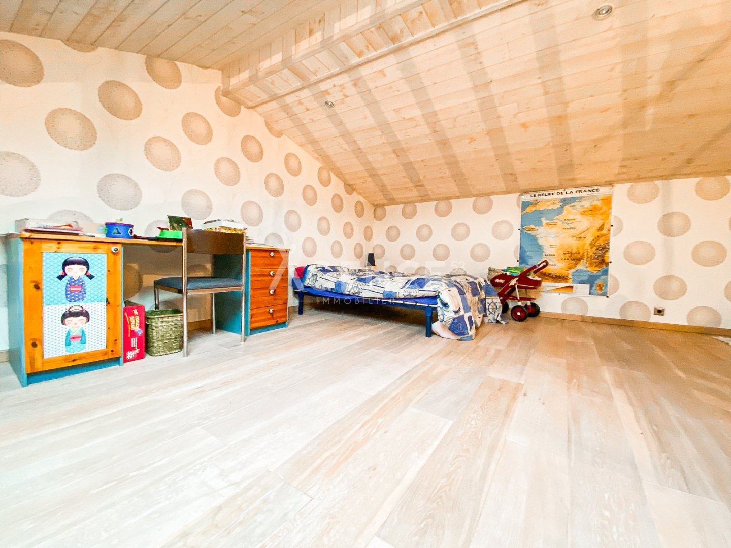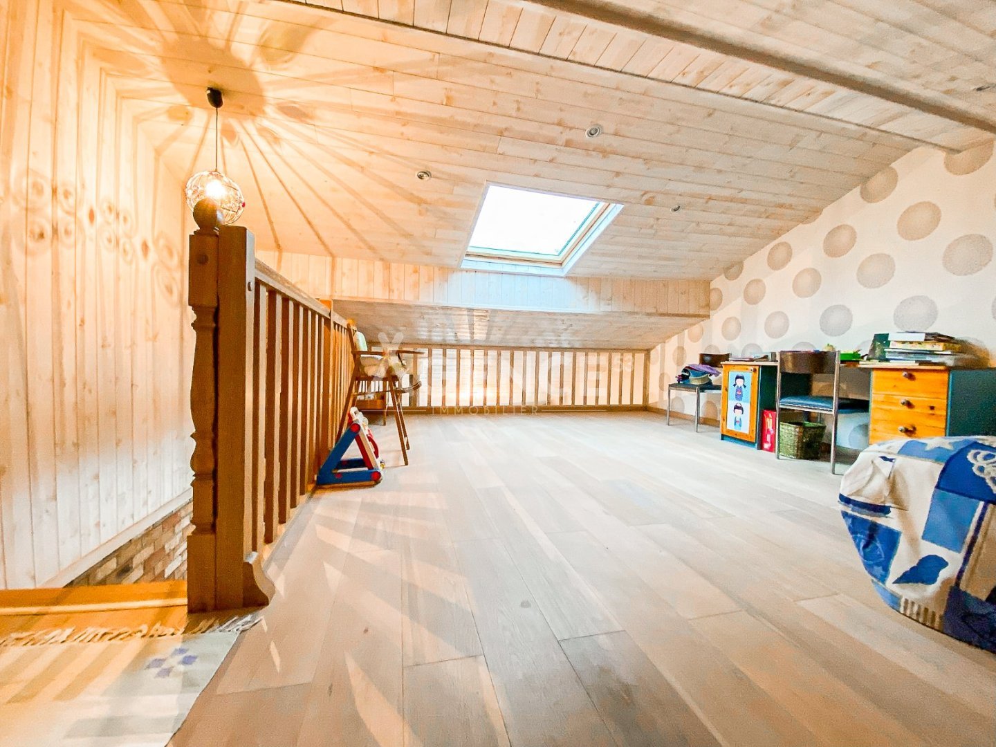 À l'étage, une grande mezzanine polyvalente peut accueillir un bureau, un coin détente ou un espace jeux, et donne accès à une quatrième chambre.