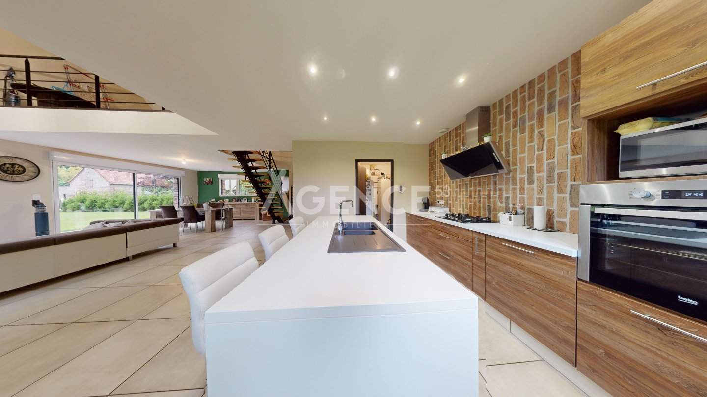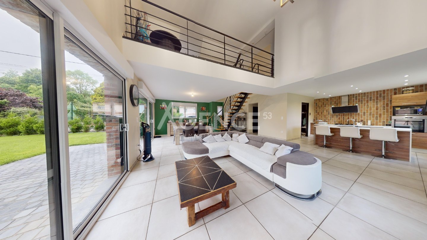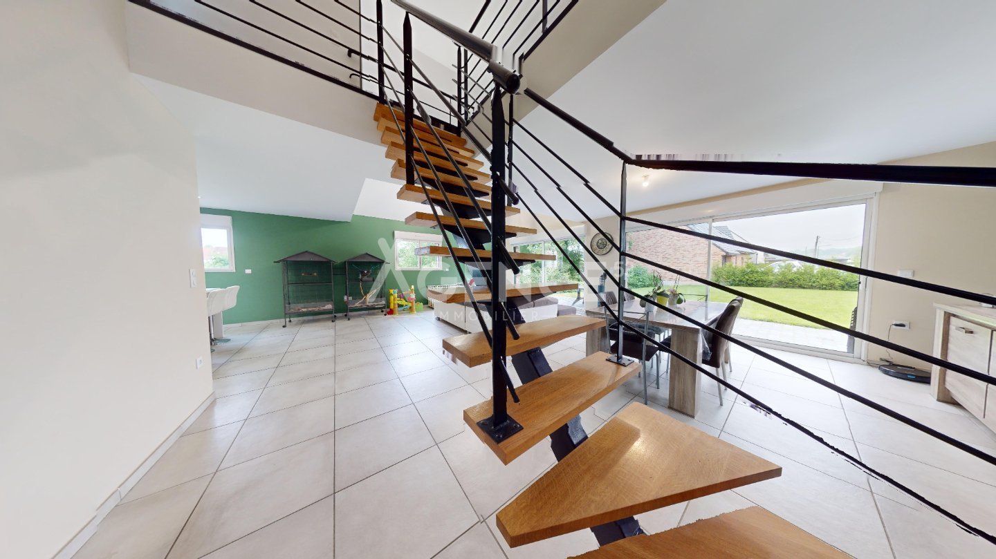 L'habitation se compose d'une grande pièce de vie ultra lumineuse, ouverte sur la cuisine équipée et aménagée, une chambre, un wc et un cellier. À l'étage, elle dispose d'un palier en mezzanine de plus de 20m2, avec garde corps offrant une vue sur le rez-de-chaussée, 3 chambres, un wc, et une salle de bains avec douche et baignoire.